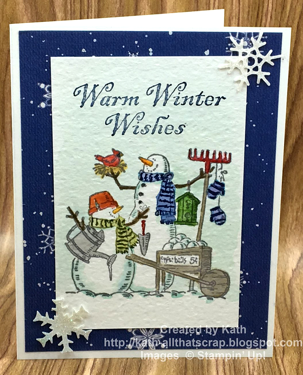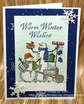 As usual we have some terrific projects by the Watercooler Artists to get your creative juices flowing. You can see how many different ways a Christmas card can be created, from the cute to the elegant. For details on how Kath and the other Watercooler Artists created their projects, just click on the name underneath and you will be taken to that blog post. We begin with Kath's wonderfully coloured, whimsical snowmen: