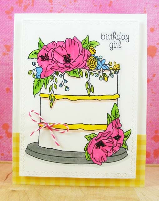 Donna's Rocker: I love Bev's use of bright colors on her cake. Excellent job of coloring and composition. Bev's "anchoring" the cake to the yellow gingham "tablecloth" as a background layer is VERY effective! I'm sure her girlfriend with absolutely love her card!!!