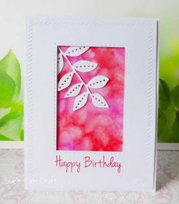 Tristan's Choice:   Sue has used a gorgeous colour scheme on her card and a fabulous technique with the ghosting. The panel is perfectly highlighted with the die cut leaves.